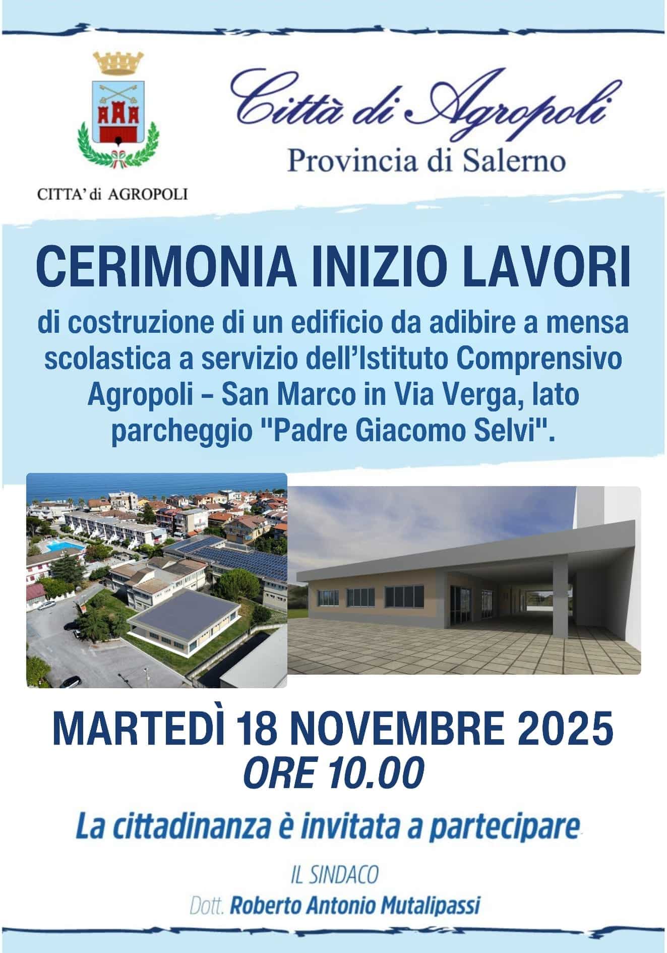 È in programma martedì 18 novembre la cerimonia di inizio dei lavori di costruzione di un edificio da adibire a mensa scolastica a servizio dell’Istituto Comprensivo “Agropoli – San Marco”.