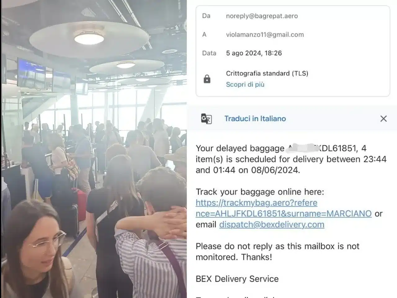 ”Quello che era il viaggio dei nostri sogni rovinato dalla compagnia aerea costretti a dormire in aeroporto ed a vivere la nostra vacanza senza i nostri bagagli e senza alcun effetto personale. L’unica speranza era seguire i nostri bagagli con l’airtag – un localizzatore GPS e l’assurdità e che questi erano in aeroporto ma nessuno li trovava”