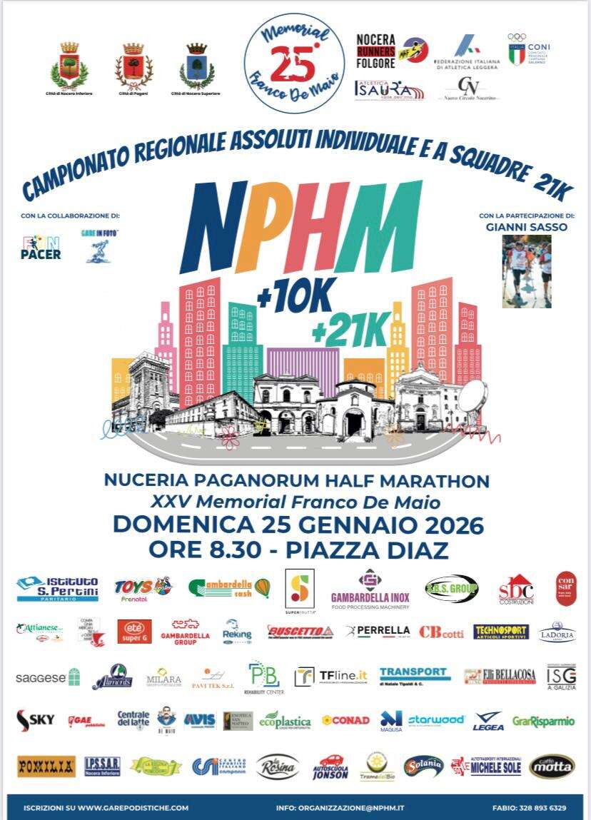 L’Amministrazione Comunale di Nocera Inferiore ha indetto la conferenza di presentazione della “Nuceria Paganorum Half Marathon 2026 – 25º Memorial Franco De Maio”, in programma il 25 gennaio. L’incontro si terrà martedì 20 gennaio alle ore 11:00 presso l’Aula Consiliare del Comune.