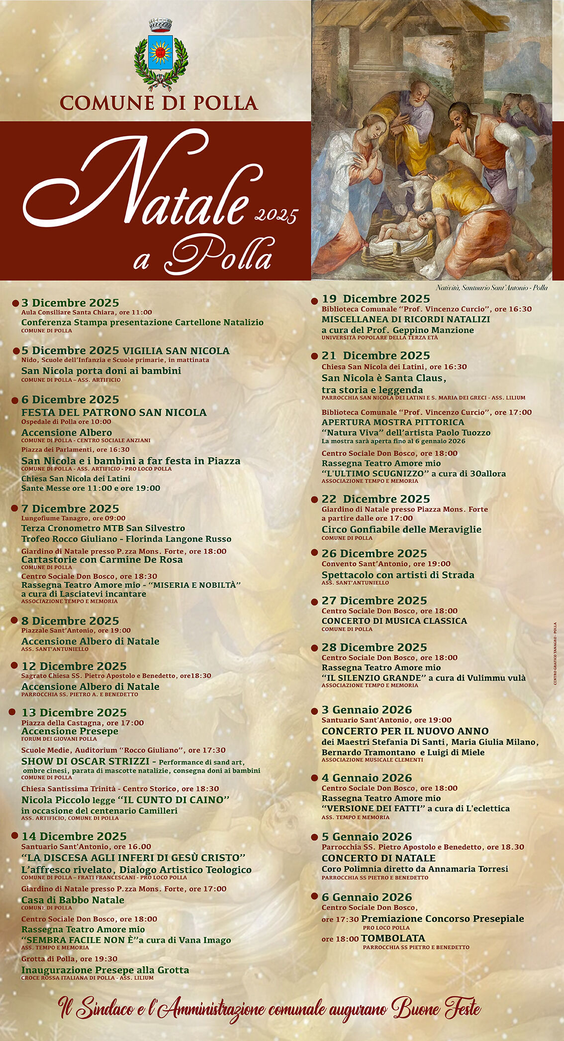 A Polla è stato presentato mercoledì 3 dicembre il cartellone natalizio 2025-2026: eventi culturali, musicali, sportivi e iniziative per bambini dal 5 dicembre al 6 gennaio, con accensione dell’albero e gemellaggi internazionali.